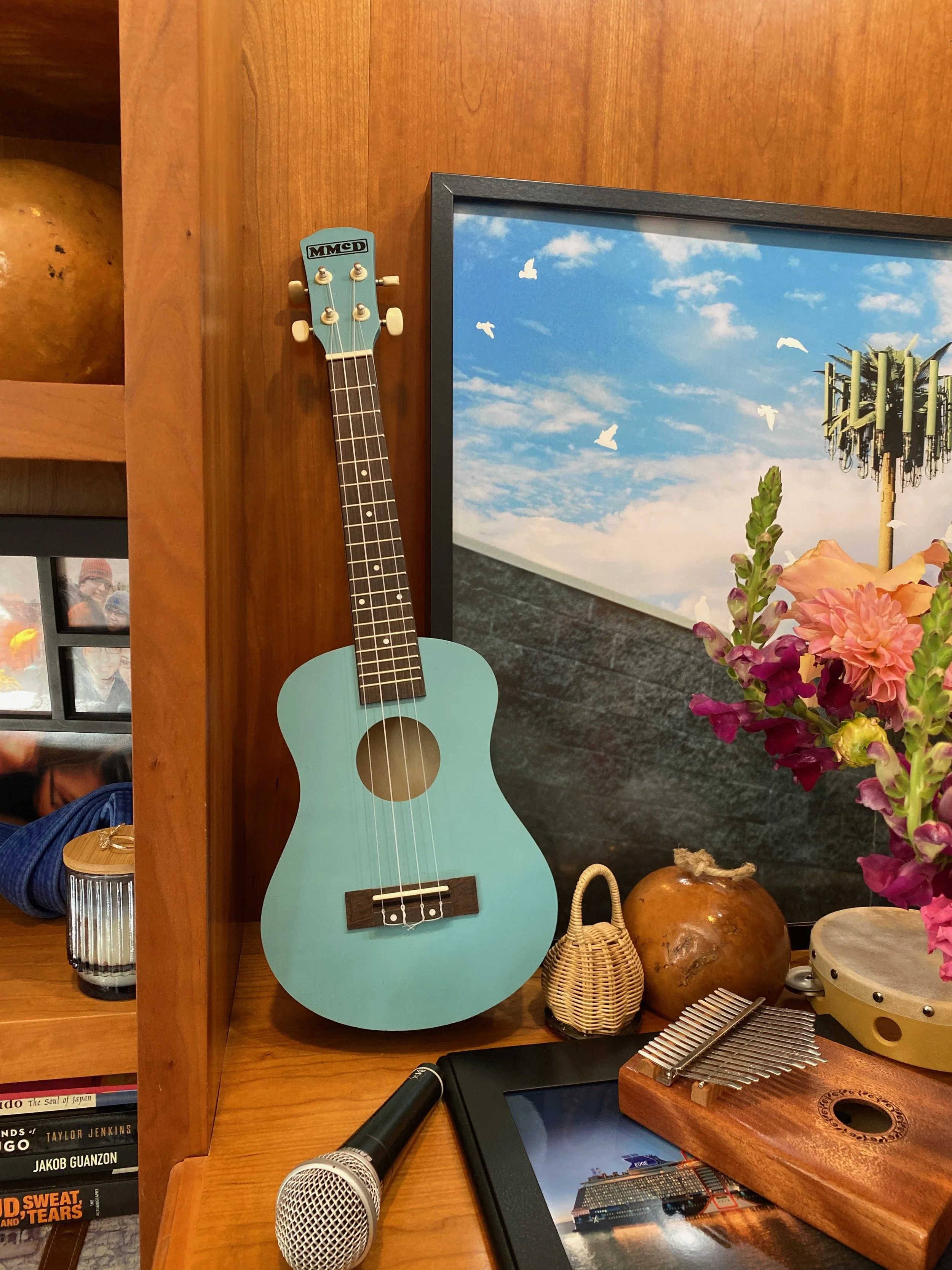 Light blue toy ukulele with wood fretboard, black and white strings, and black bridge, placed upright against a wooden wall among various decorative items and framed pictures.