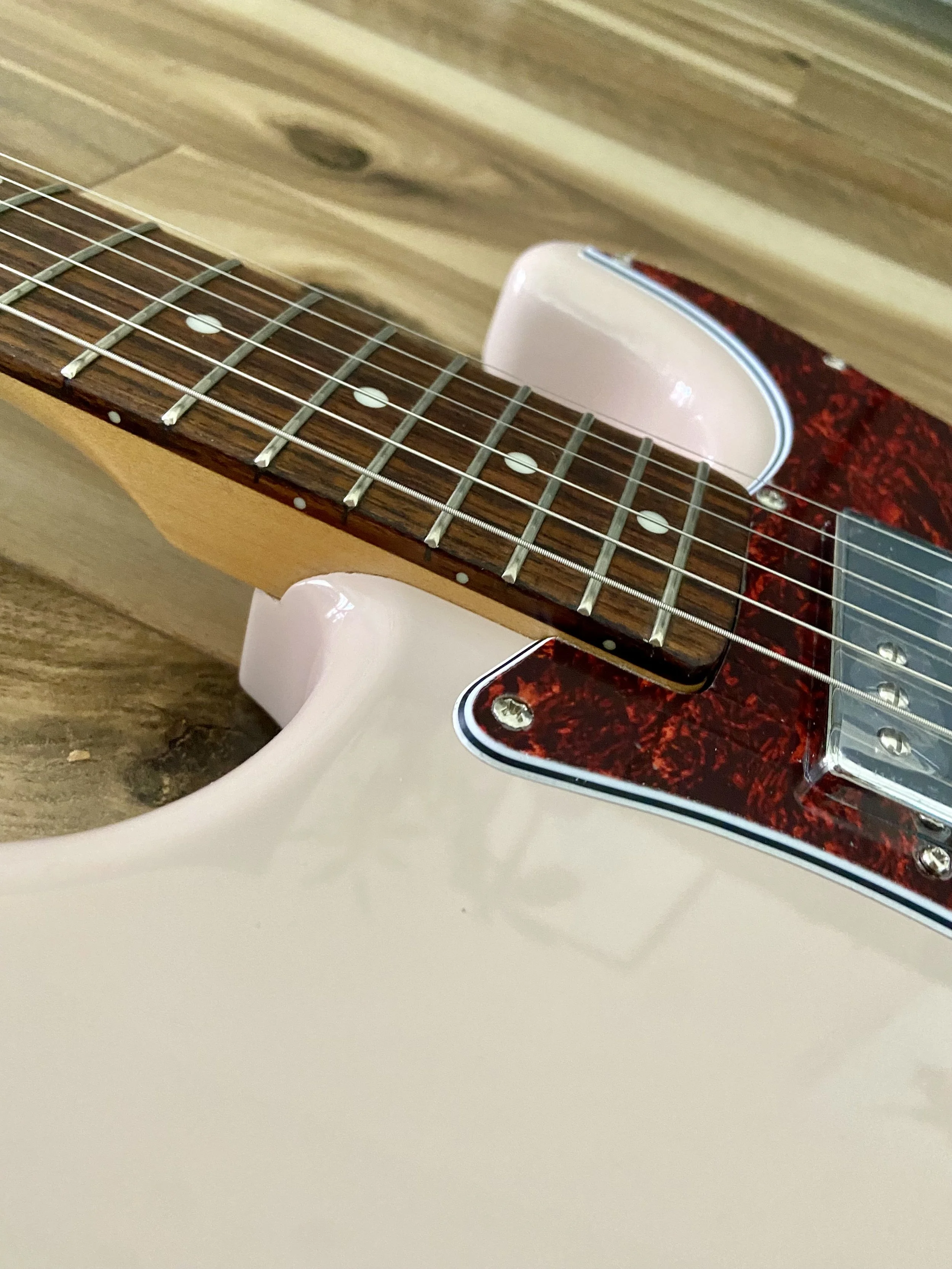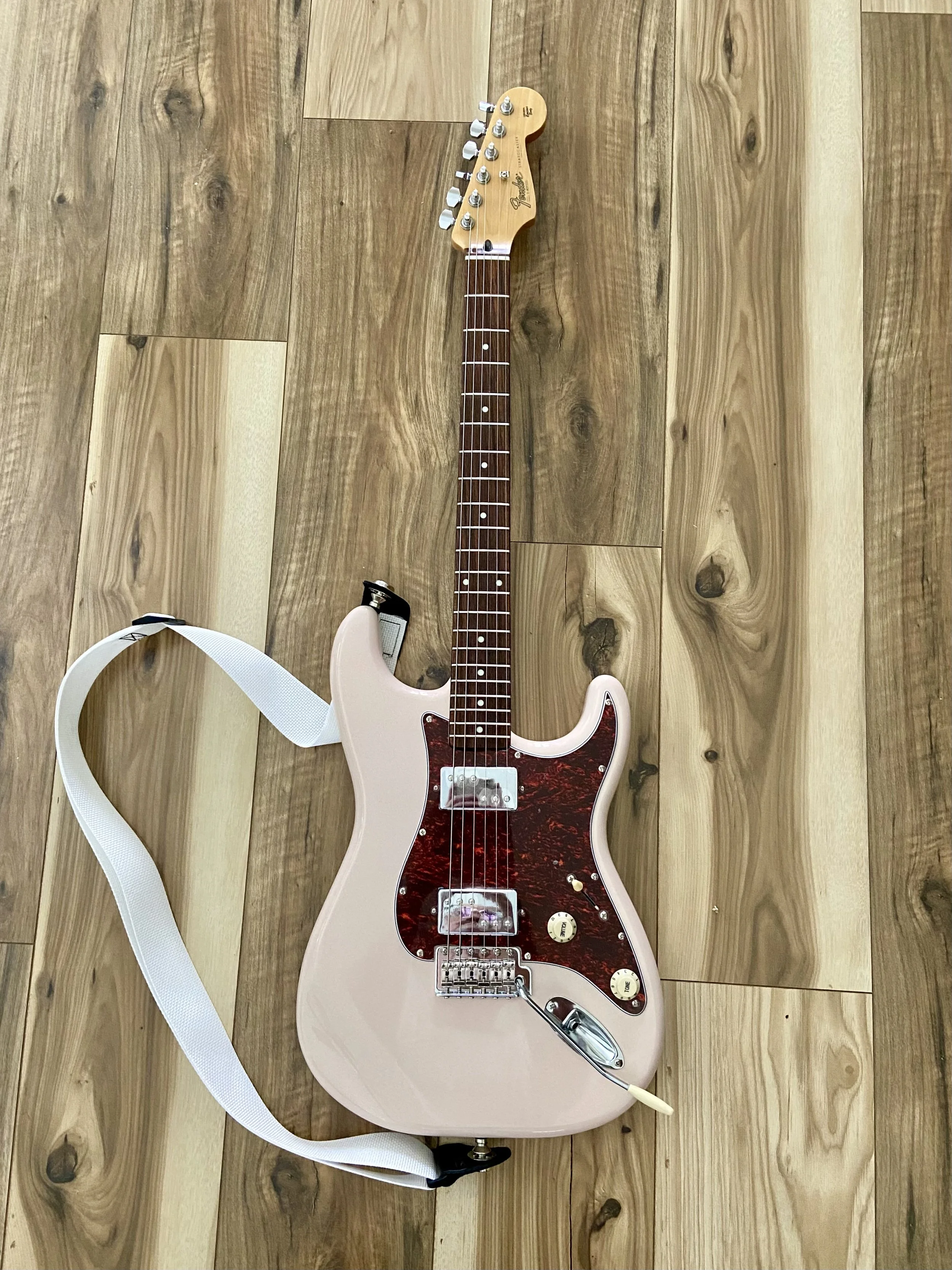 A Fender electric guitar in a light pink color with a tortoiseshell pickguard, lying on a wooden floor, with a white strap attached.
