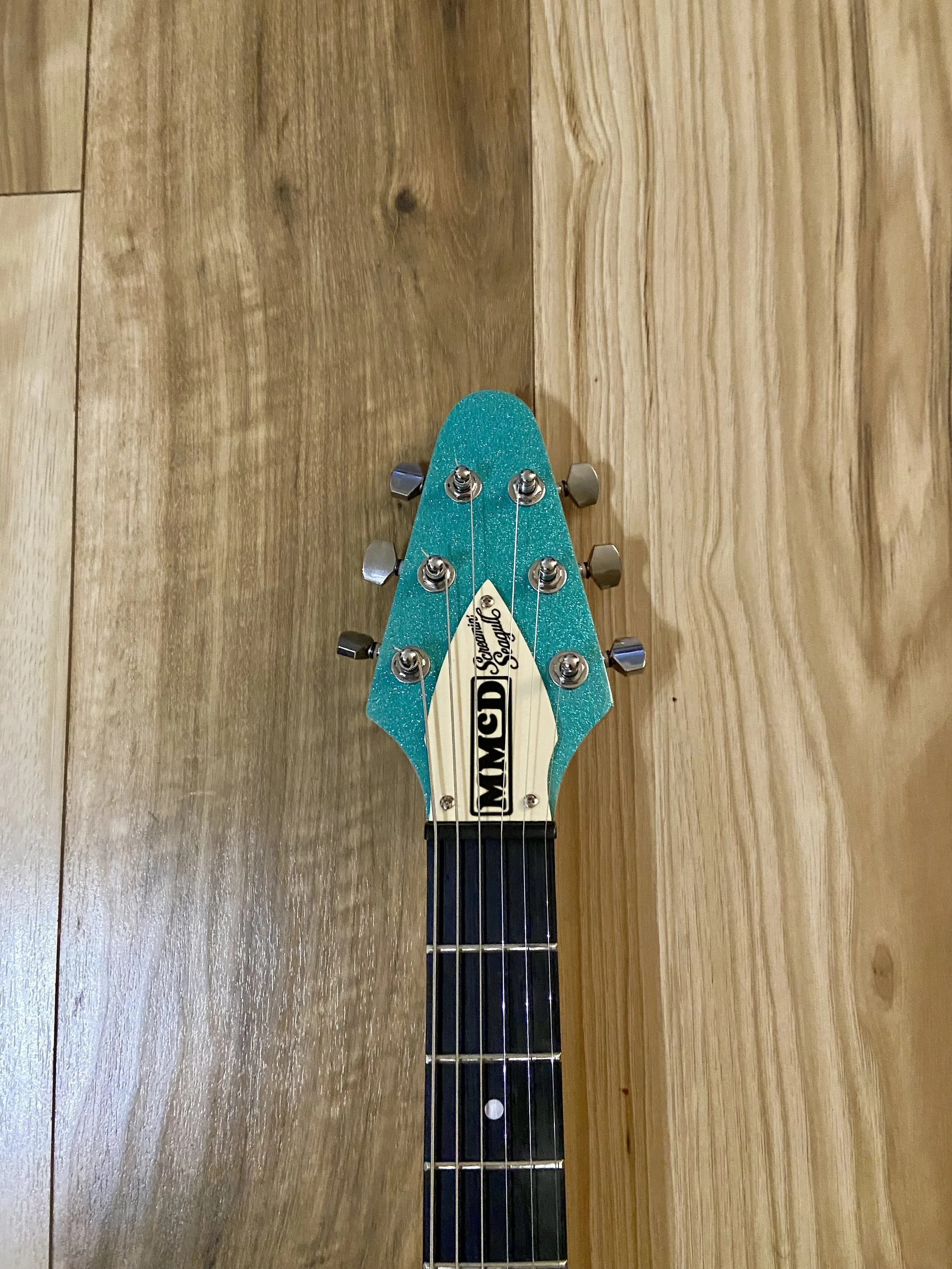Close-up of a turquoise slotted guitar headstock with tuning pegs and a cream-colored label reading 'MMCD Screamin’ Seagull' on a wooden surface.