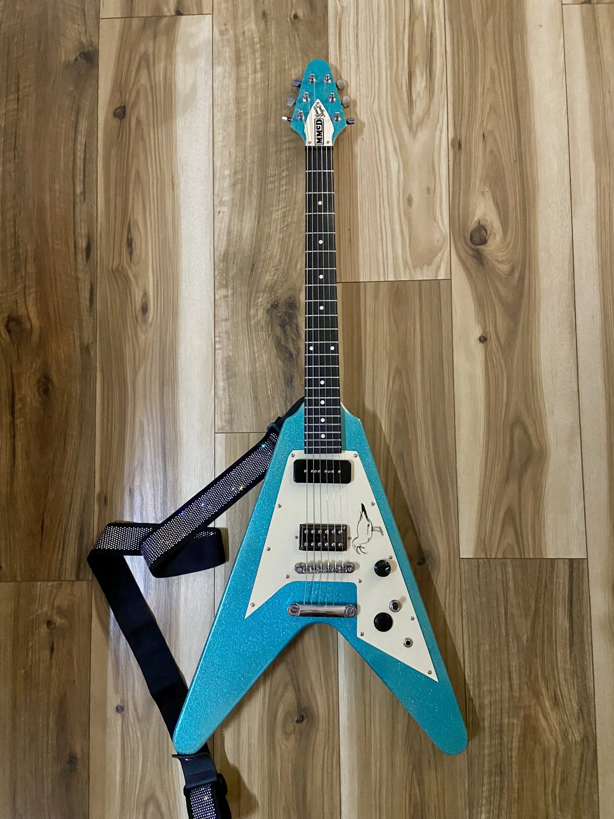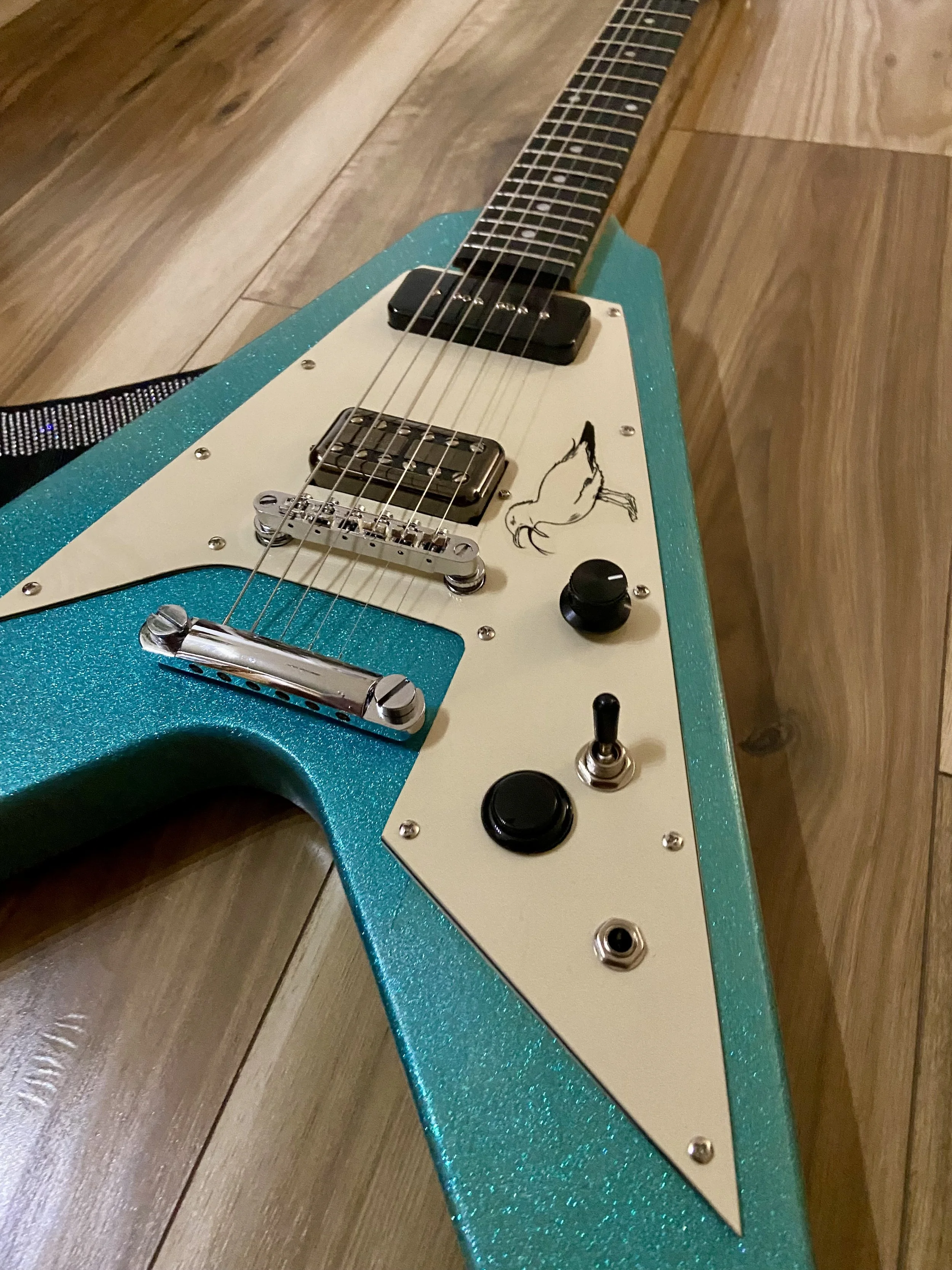 A teal electric guitar with a white pickguard, black knobs, and a painted dove on the pickguard, placed on a wooden floor.