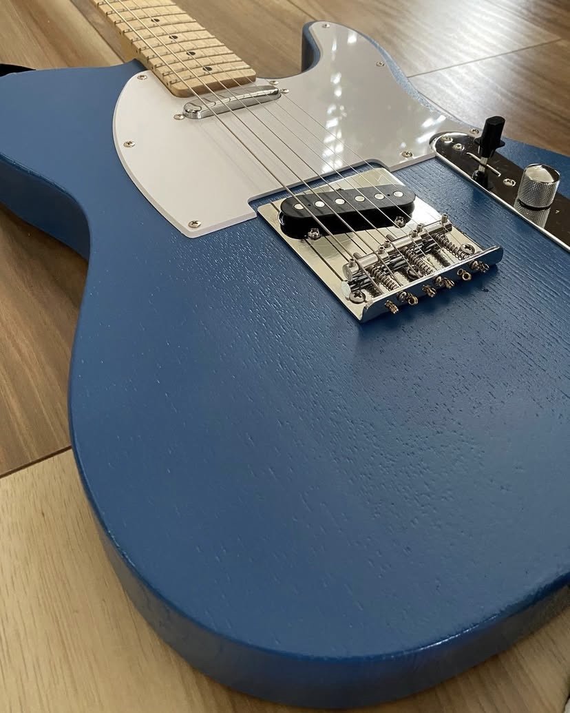 Blue electric guitar with a white pickguard and a maple neck, lying on a wooden surface.