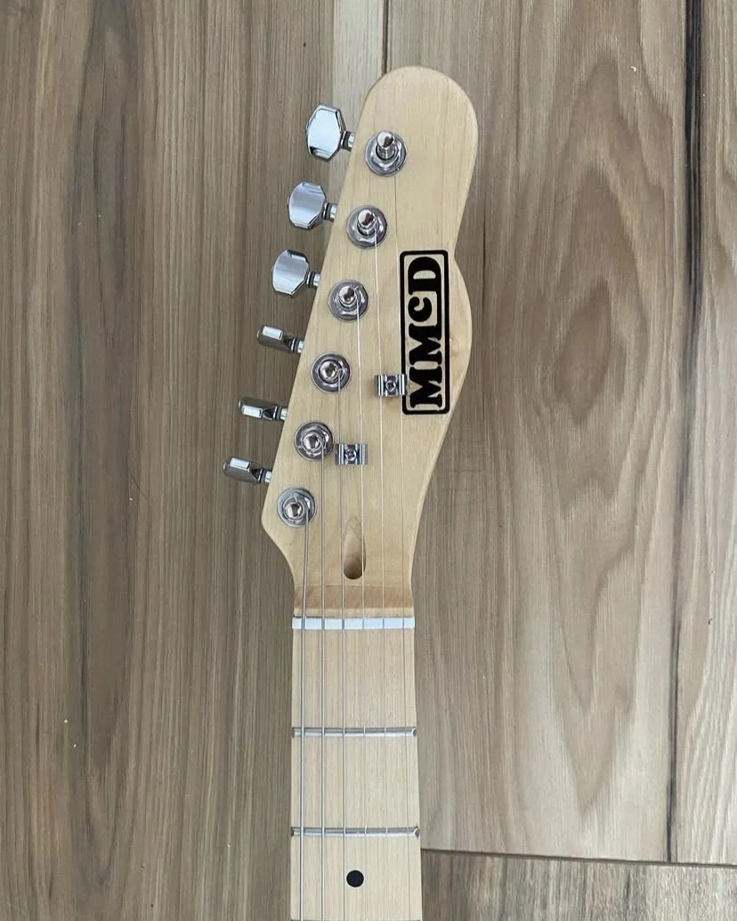 Close-up of an unfinished electric guitar headstock with tuning pegs, strings, and a brand logo that reads 'MINGD' on a wooden background.